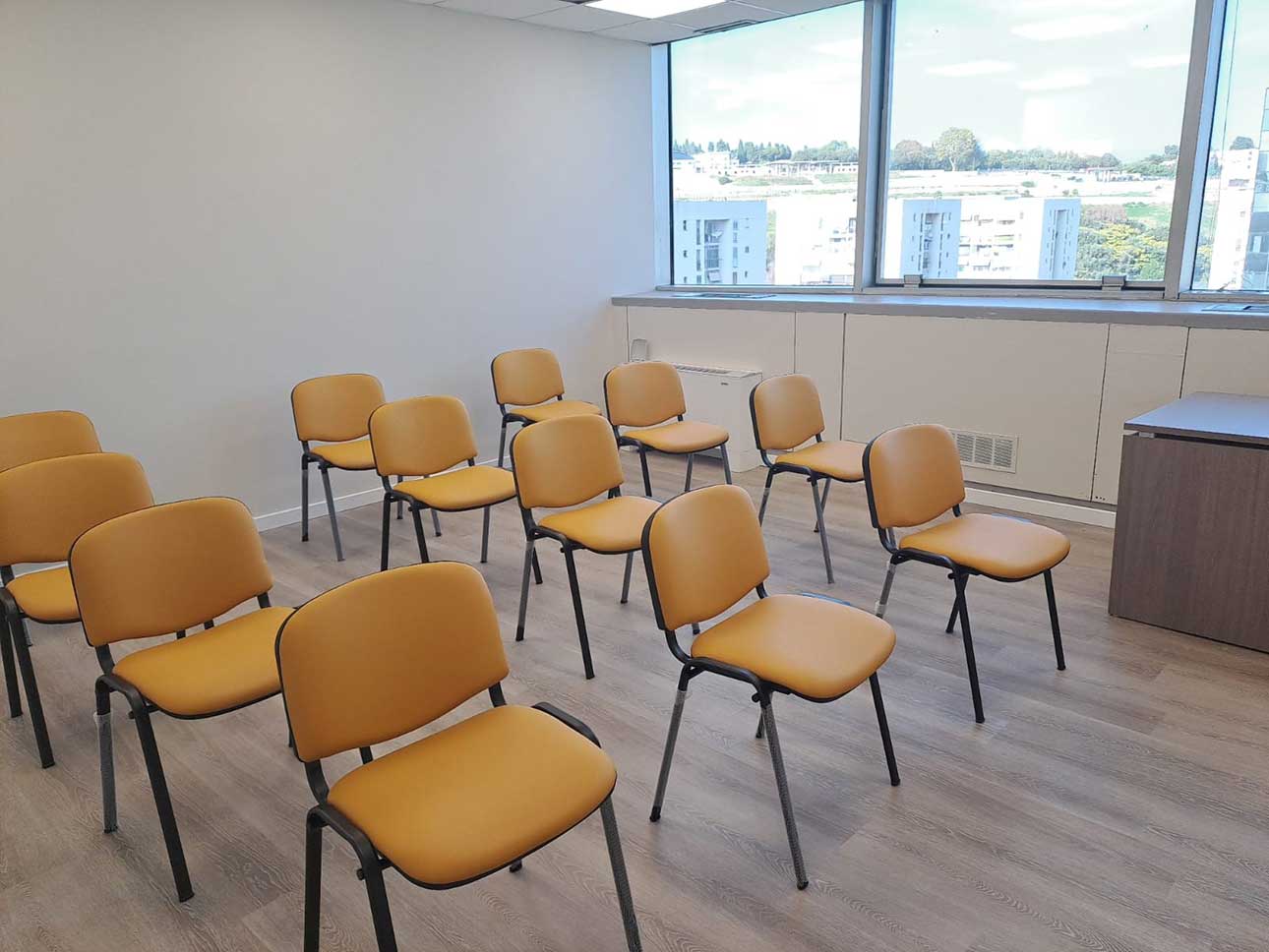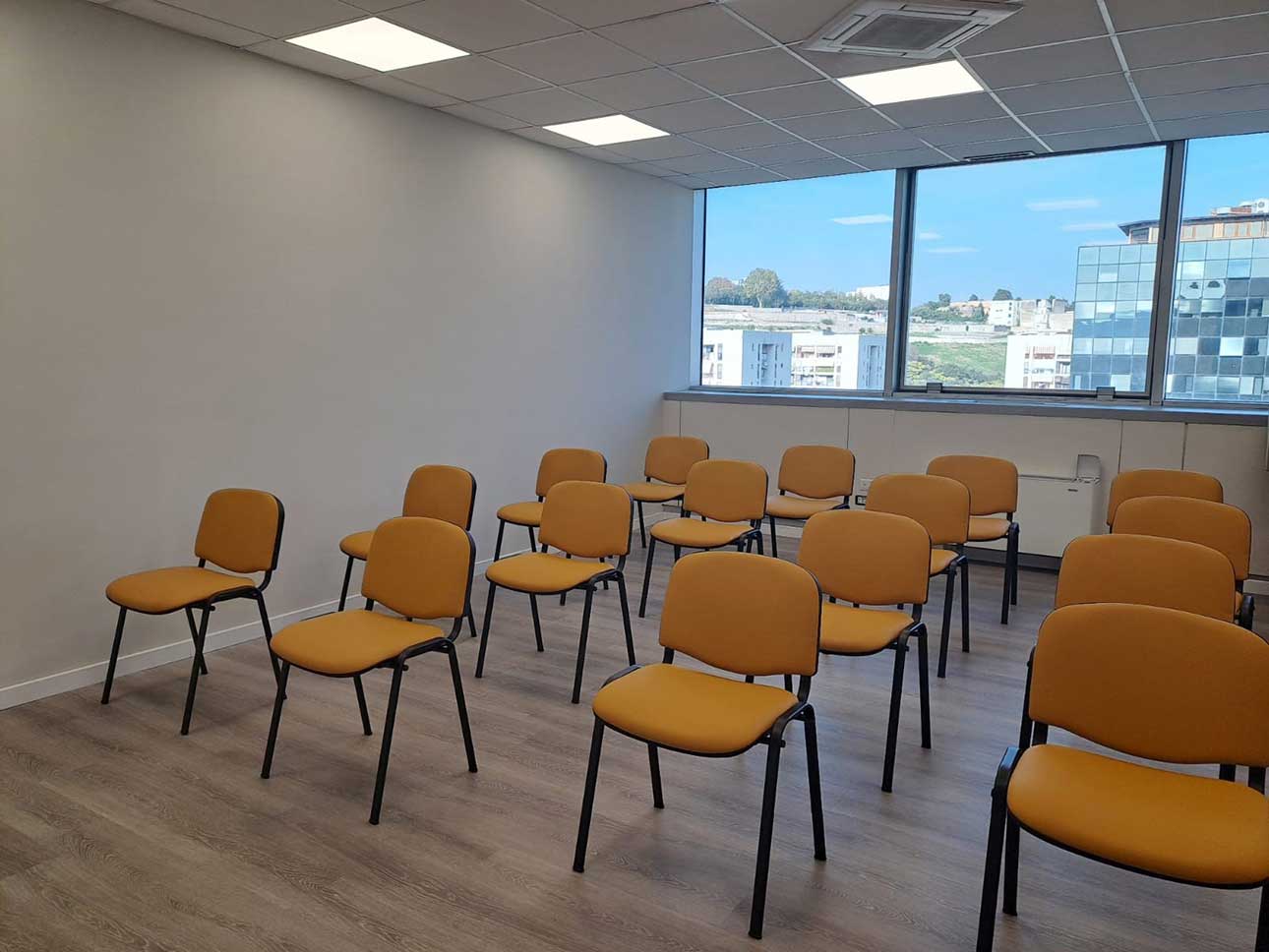 • 2 aule didattiche di 26 mq e 32 mq attrezzate con sedie (o sedie a ribaltina), scrivania docente, monitor lcd o videoproiettore, connessione Wi-Fi