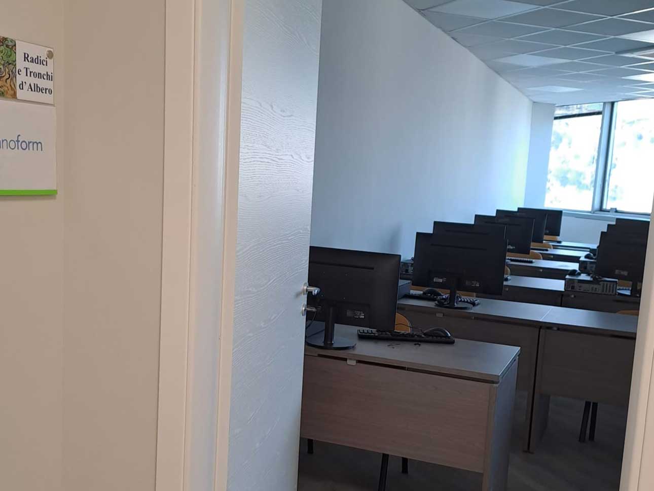 • 1 aula di circa 41 mq attrezzata con n. 18 postazioni informatiche, scrivania docente, monitor lcd o videoproiettore, connessione Wi-Fi